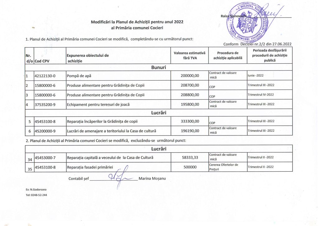 Modificări la Planul de Achiziții pentru anul 2022