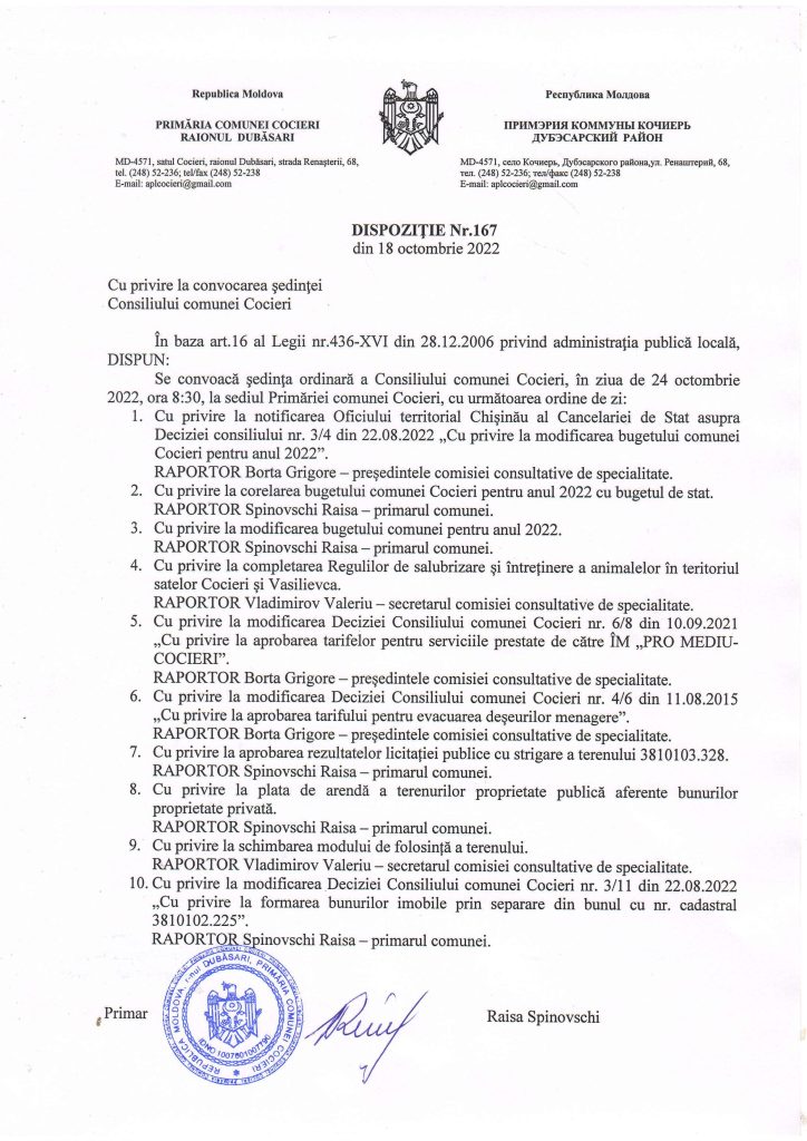 Convocarea ședinței Consiliului comunei Cocieri în ziua de 24 octombrie 2022