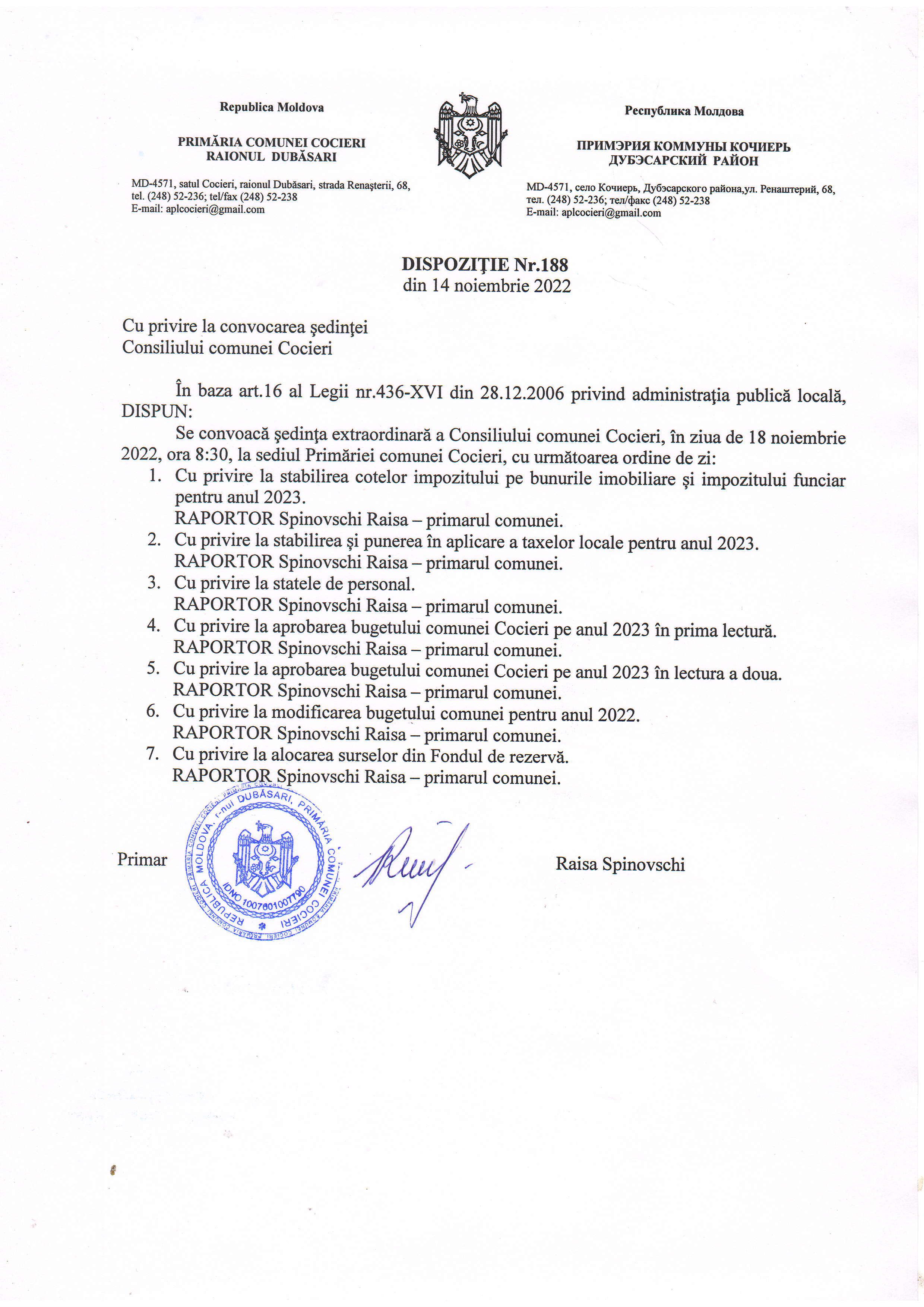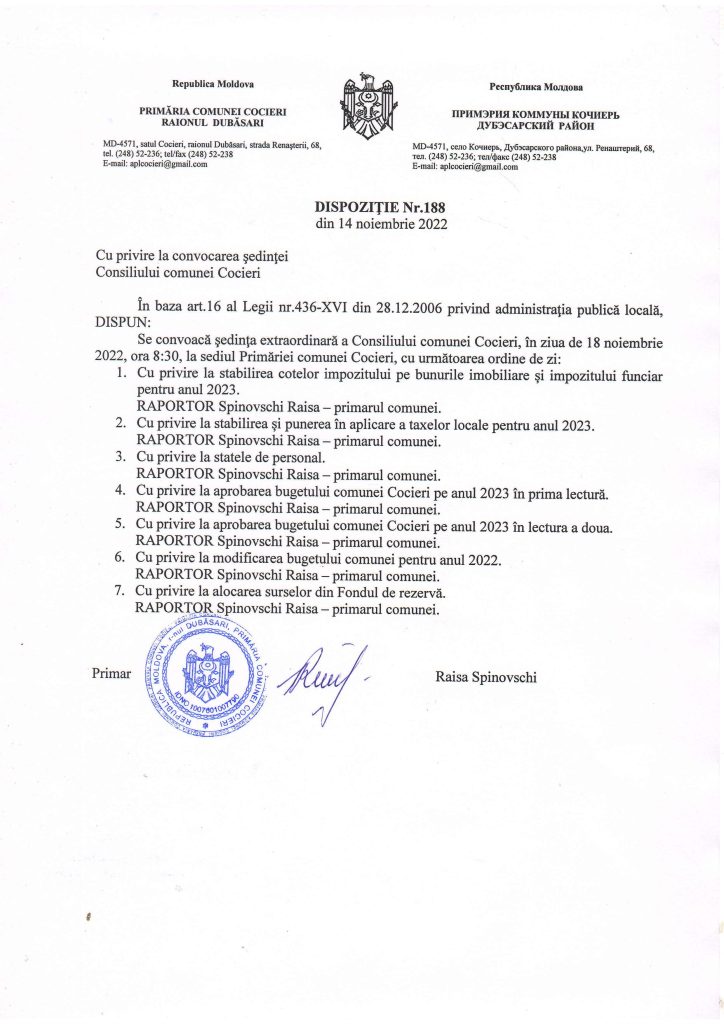 În ziua de 18 noiembrie 2022 se convoacă ședința extraordinară a Consiliului comunei Cocieri