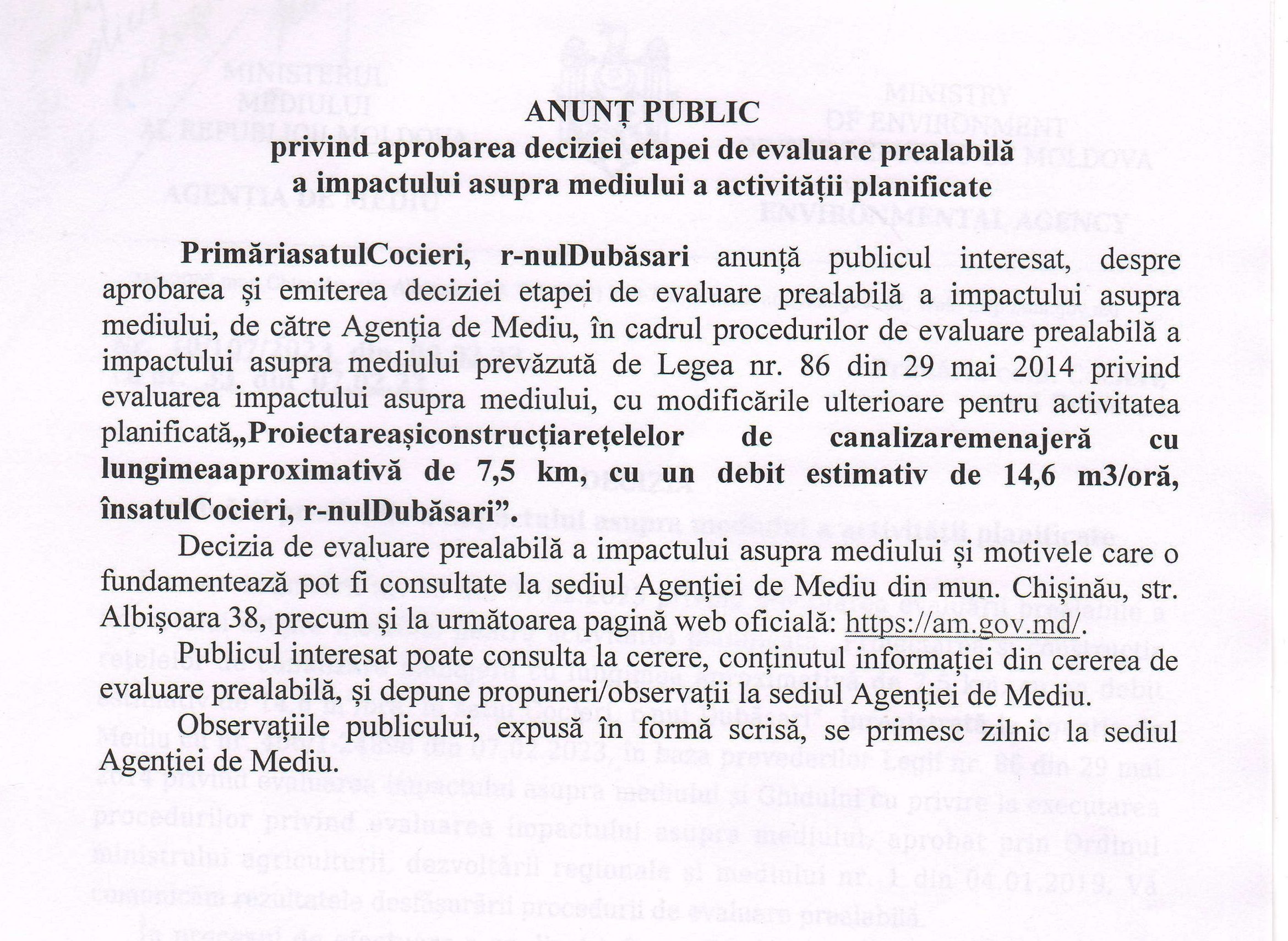 Anunț – Etapa de evaluare prealabilă a impactului asupra mediului a activității planificate