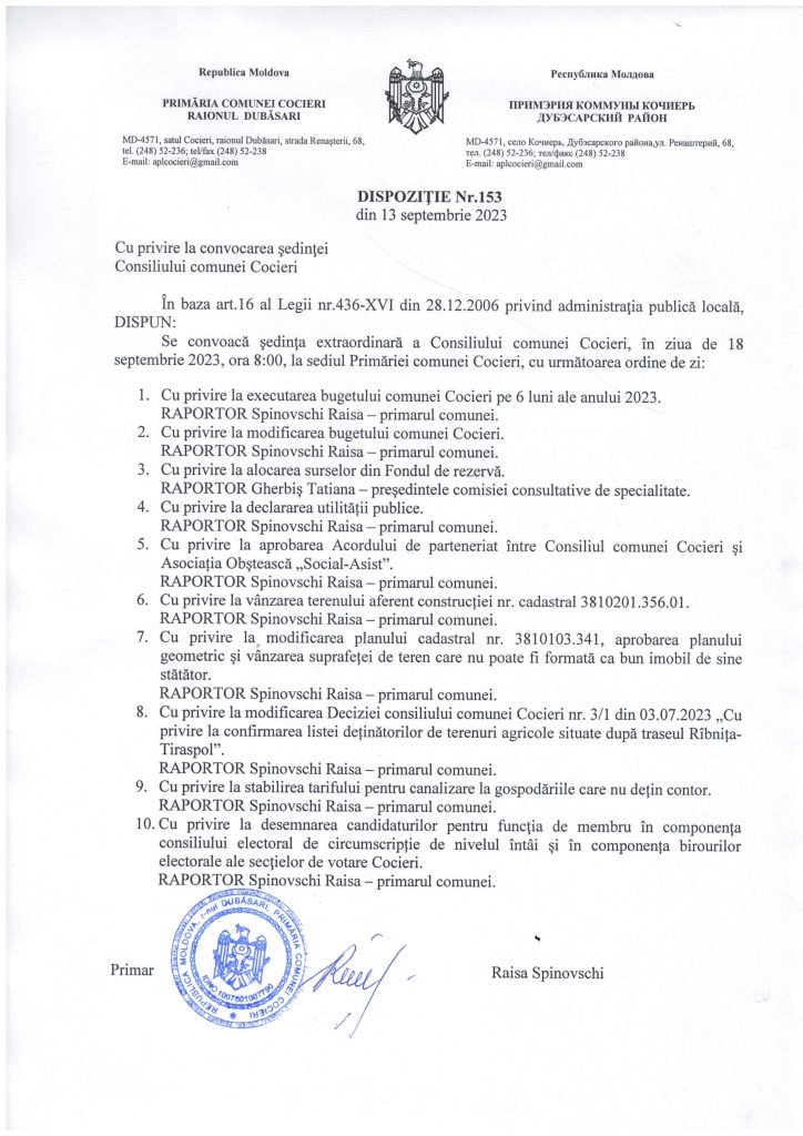 Dispoziție: Convocarea ședinței consiliului din 18.09.2023
