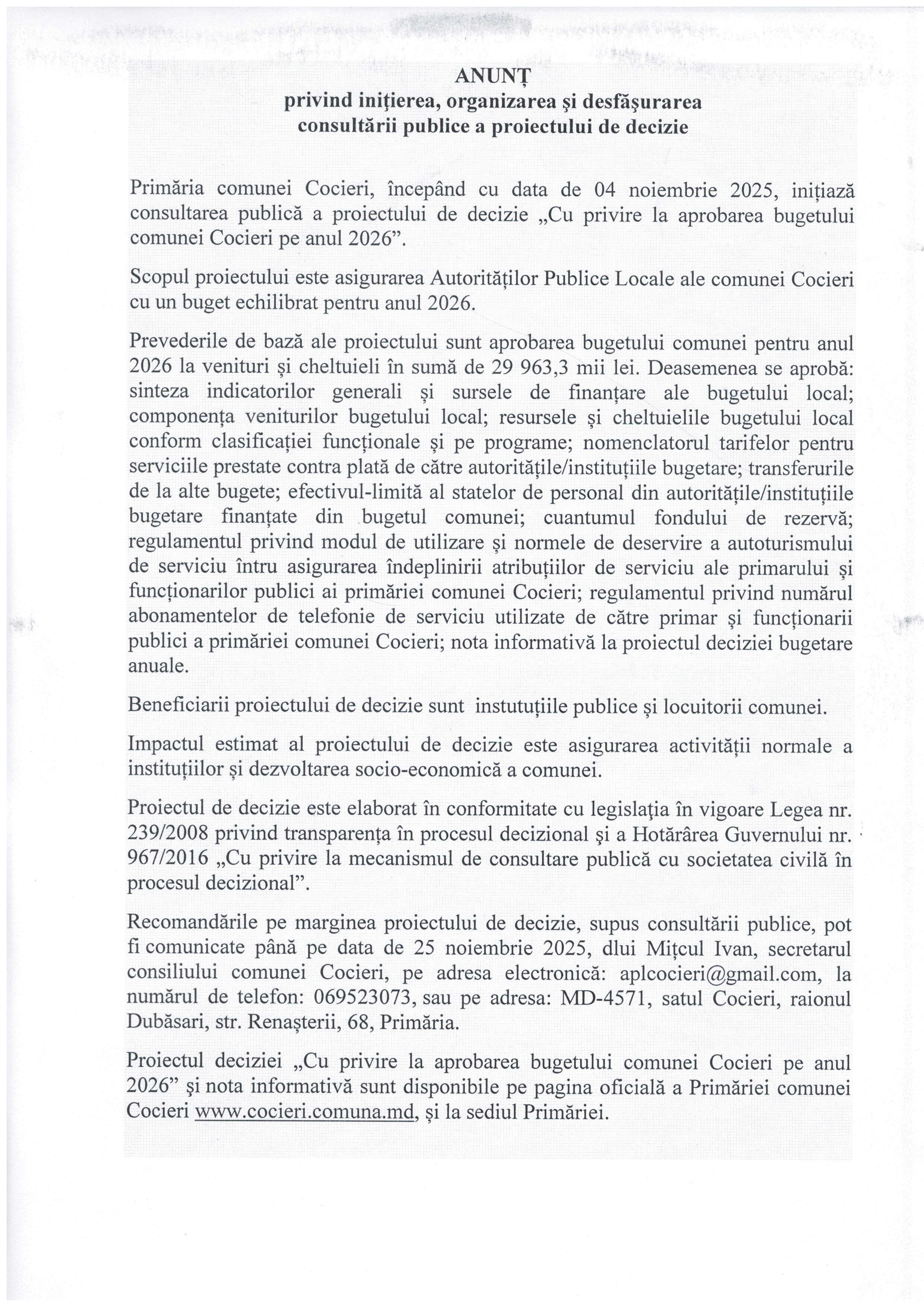 ANUNȚ Consultare publică a proiectului de decizie „Cu privire la aprobarea bugetului comunei Cocieri pe anul 2026”