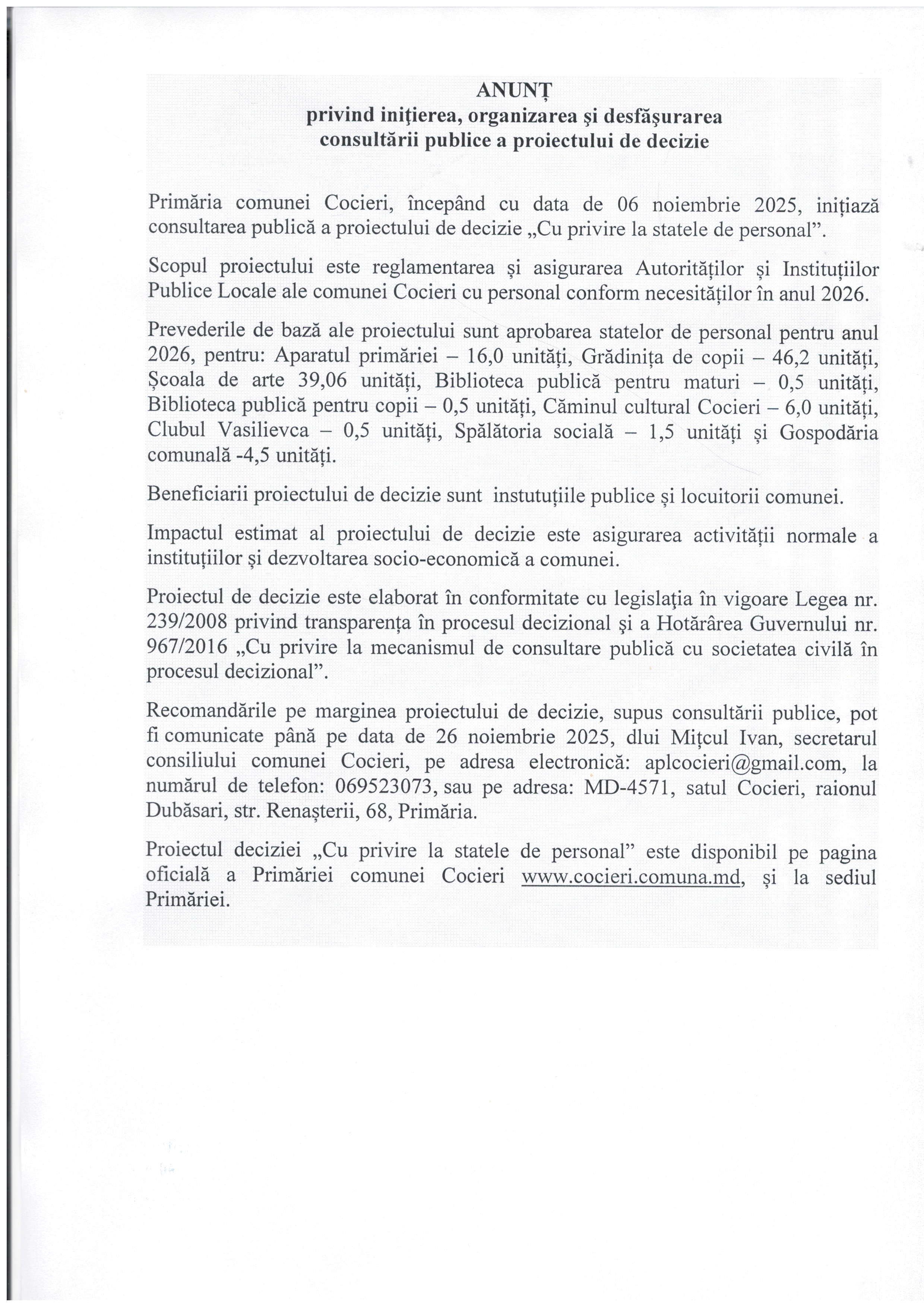 ANUNȚ privind organizarea și desfășurarea consultării publice a proiectului de decizie „Cu privire la statele de personal”