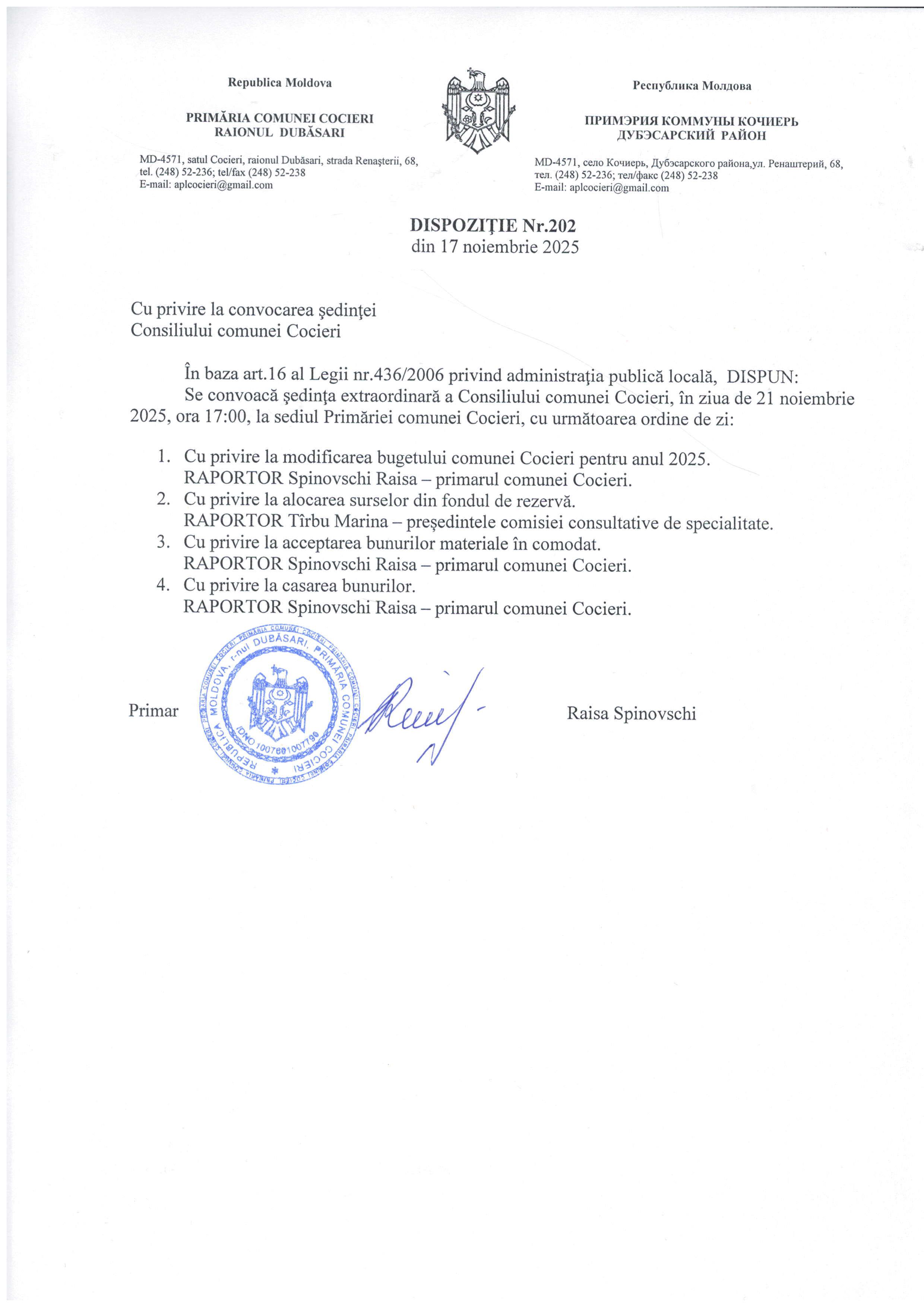 ANUNȚ cu privire la convocarea ședinței Consiliului comunei Cocieri