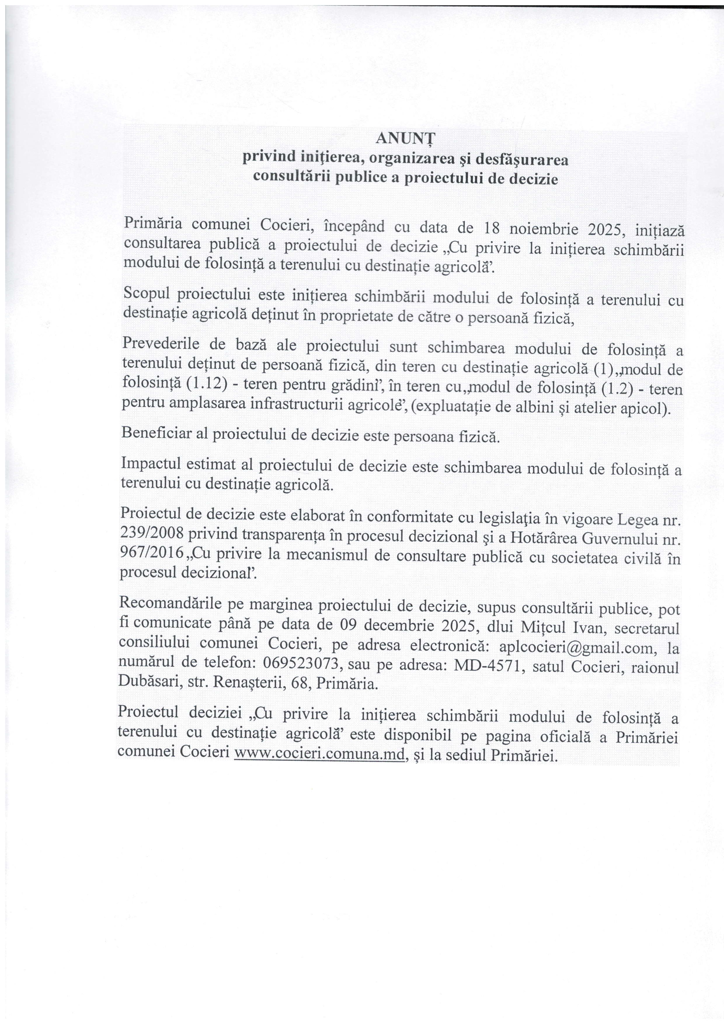 ANUNȚ privind inițierea, organizarea și desfășurarea consultării publice a proiectului de decizie „Cu privire la inițierea schimbării modului de folosință a terenului cu destinație agricolă”