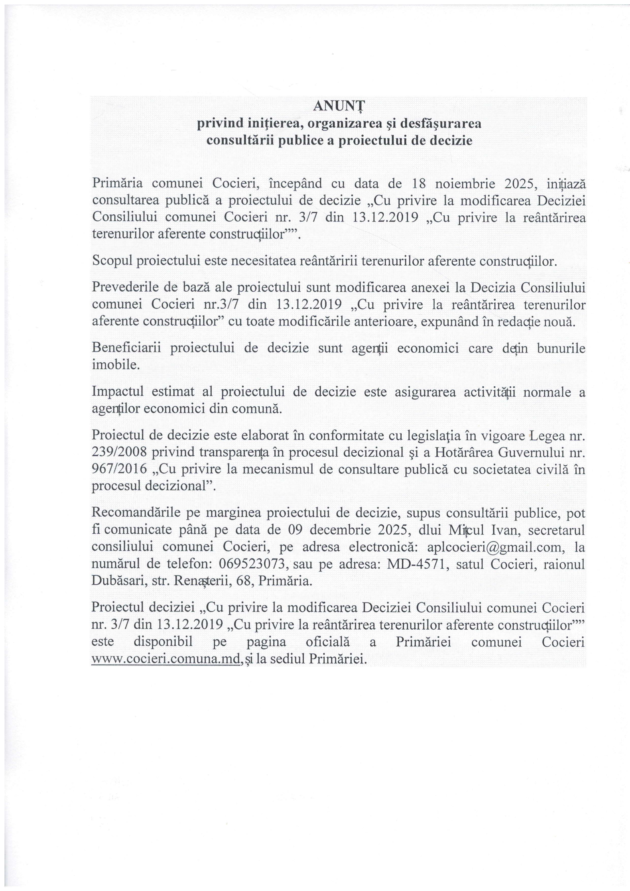 ANUNȚ privind inițierea, organizarea și desfășurarea consultării publice a proiectului de decizie „Cu privire la reântărirea terenurilor aferente construcțiilor”